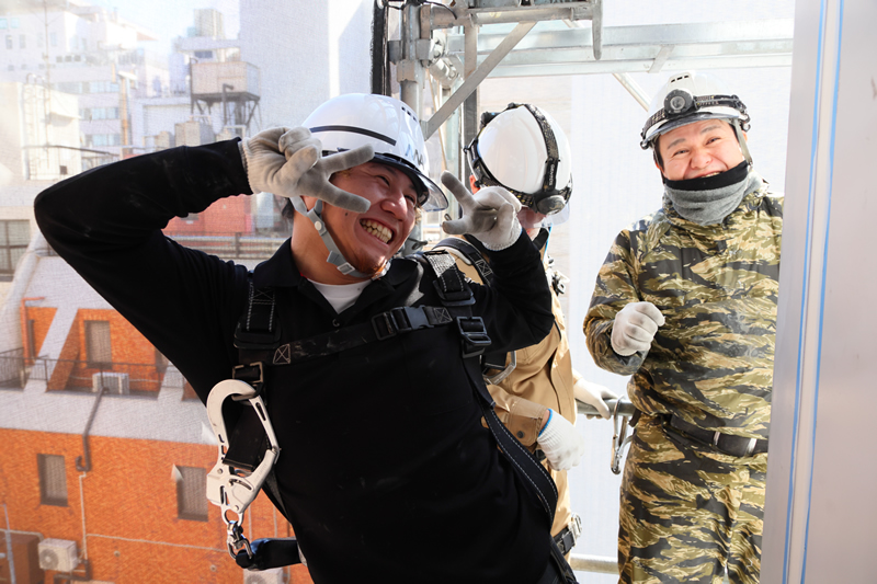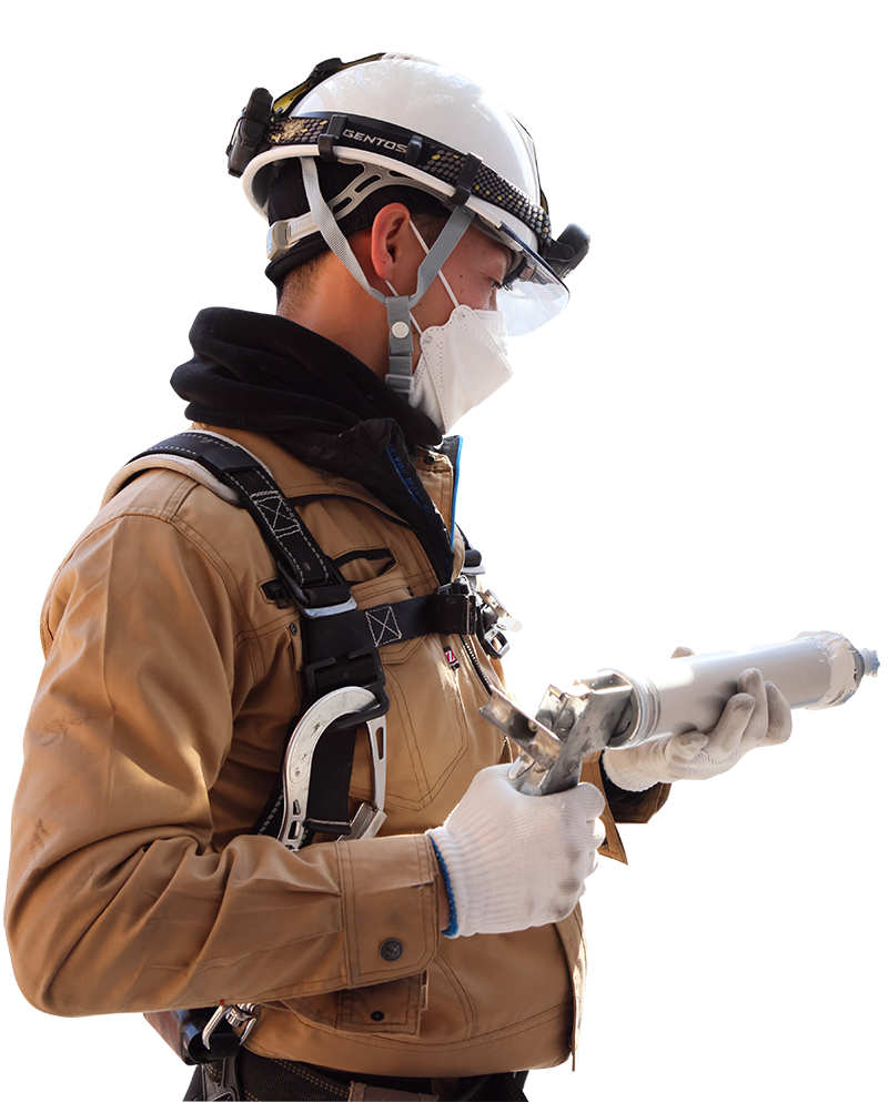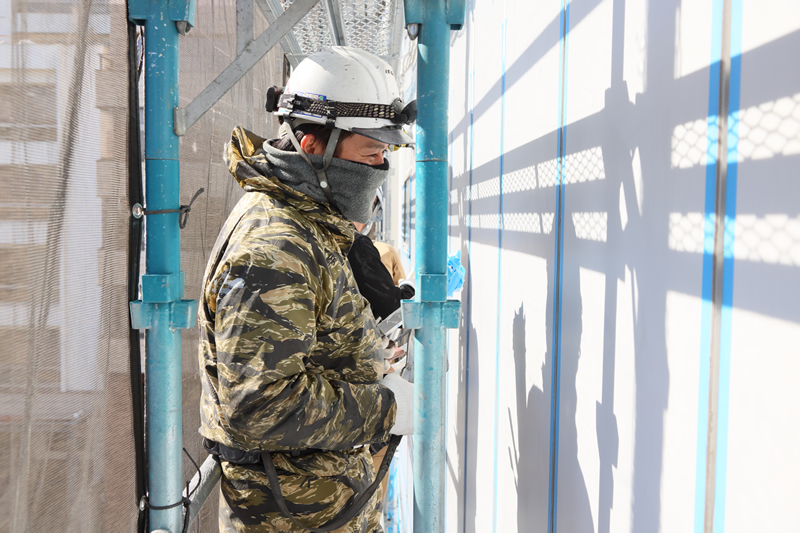 シーリング工事とは、 外壁のボードやタイル同士のつなぎ目(境目)、またはサッシの金具と壁のつなぎ目などをシーリング材で埋める工事になります。まずは足場に登り、現場に慣れることからスタートしていただきます。道具の使い方や作業手順を覚えながら、できることから始めていきましょう。 先輩社員が丁寧に指導しますので、ご安心ください。 また社長自ら現場に立つことが多いので、質問や相談にも随時対応します!